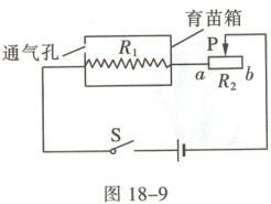 1. 如图18-9是一个温度可调的育苗箱电路,电源电压为 36 V,且保持不变。发热电阻 $R_1$ 的阻值为 40 Ω,$R_2$ 为滑动变阻器其阻值变化范围为 0~50 Ω,允许通过的电流足够大。试求 $R_1$ 的最大功率是