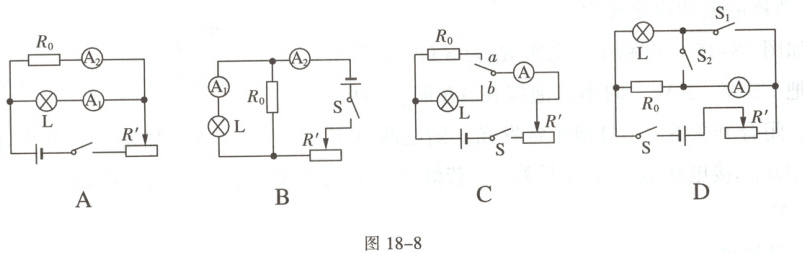9.AB[解析]A图中,灯L与R₀并联,电流表A₁、A₂分别测量通过灯L、R₀的电流,调节滑动变阻器的滑片,使电流表A₁的示数等于Iₑ,读出此时A₂的示数I₀,灯L的额定电压Uₑ = U₀ = I₀R₀,灯L的额定功率Pₑ = UₑIₑ = I₀R₀Iₑ,A设计方案能测量灯泡额定功率,故A符合题意;B图中,灯L与R₀并联,电流表A₁测量通过灯L的电流,电流表A₂测量干路电流,调节滑动变阻器的滑片,使电流表A₁的示数等于Iₑ,读出此时A₂的示数I,通过R₀的电流I₀ = I - Iₑ,灯L的额定电压Uₑ = U₀ = I₀R₀ = (I - Iₑ)R₀,灯L的额定功率Pₑ = UₑIₑ = (I - Iₑ)R₀Iₑ,B设计方案能测量灯泡额定功率,故B符合题意;C图中,单刀双掷开关,连接b时,调节滑动变阻器的滑片,能使电流表A的示数等于Iₑ,无法测量灯的额定电压,无法计算灯的额定功率,C设计方案不能测量灯泡额定功率,故C不符合题意;D图中,闭合S、S₁,断开S₂,灯L与R₀并联,电流表A测量通过R₀的电流,调节滑动变阻器的滑片,无法测量灯的额定电流,无法计算灯的额定功率,故D不符合题意。