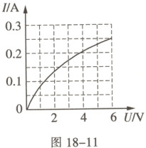 3. 标有 “6 V 1.5 W” 的小灯泡,通过它的电流随两端电压变化的关系如图18-11所示。若把这样的三只灯泡串联起来接在 12 V 的电源两端,此时每个灯泡的电阻为