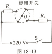 5. 某款电炖盅有加热和保温两个挡,保温挡功率为 40 W。如图18-13,是电炖盅简化的电路图,已知 $R_1 = 4R_2$。电炖盅的旋钮开关处于图示位置时是