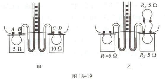 1. 图18-19所示是探究 “电流产生热量与哪些因素有关” 的实验装置,两个透明容器中密封着等量的空气。