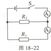 2. 如图18-22所示电路,电阻$R_1=10\ \Omega$,闭合开关$S$,电流表$A_1$的示数为$0.5\ A$,电流表$A_2$的示数为$0.3\ A$。下列说法正确的是(