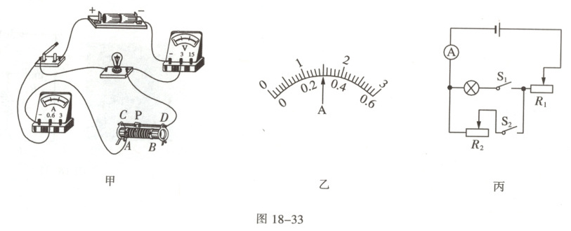 (1)如图18-33甲所示是某同学开始时连接的电路,仔细观察发现该电路存在连接错误,但只需改动一根导线,即可使电路连接正确。请你在应改动的导线上画“$×$”,并用笔画线代替导线画出正确的接法。