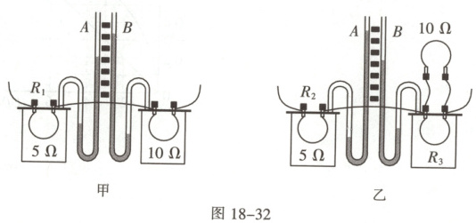 1. 在探究“电流通过导体产生的热量与哪些因素有关”的实验中,小明采用了如图18-32甲、乙所示的实验装置,其中两次实验电源电压相同,两个透明容器中封闭着等质量的空气。下列相关说法正确的是(