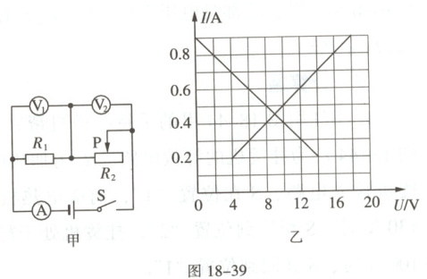 6. (多选)如图18-39甲所示的电路,电源电压保持不变,闭合开关$S$,滑动变阻器$R_2$的滑片$P$从右端滑到左端的过程中,$R_1$、$R_2$的$I-U$关系图像如图18-38乙所示。则下列判断正确的是(