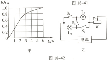 3. 科学思维 两只额定电压分别为$3\ V$和$6\ V$的小灯泡$L_1$和$L_2$,其中通过$L_2$的电流与电压的关系如图18-42甲。将它们连接到如图乙所示的电路中,当闭合开关$S_1$、$S_2$,断开$S_3$,滑片$P$置于最左端时,调节电源,使电路中一只小灯泡正常发光,另一只不超过额定电压,则电源输出电流为$1.4\ A$;当只闭合$S_3$,滑片$P$置于最右端时,调节电源,同样使电路中仅一只小灯泡正常发光,另一只不超过额定电压,此时$L_2$的电阻与变阻器连入电路中的电阻之比