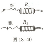 1. 如图18-40是两个定值电阻$R_1$、$R_2$的内部结构图,$R_1$、$R_2$所用电阻丝(涂有绝缘漆)粗细均匀、材料相同,分别缠绕在相同的圆柱形绝缘棒上,圈数分别为$43$圈和$33$圈,$R_1$的电阻丝比$R_2$的电阻丝细。将$R_1$、$R_2$并联在电路中工作一段时间,则通过$R_1$的电流