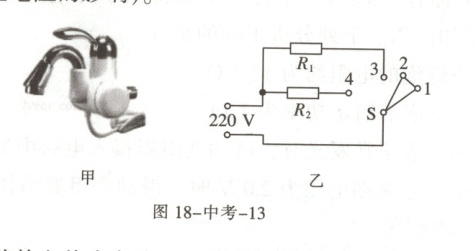6.(云南)如图,甲是某款电热水龙头,乙是它的电路原理图。$R_1$、$R_2$ 是电热丝,$R_1$=24 Ω,$R_2$=48 Ω。通过旋转手柄使扇形开关S同时接触两个相邻触点实现冷水、温水、热水挡的切换。当开关S接触2、3触点时,水龙头放出的是