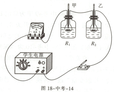 1.(辽宁)如图,甲、乙两个透明容器内均装有质量为100 g、初温为25 ℃的某种绝缘液体,甲、乙中都有一段电阻丝,$R_1$=5 Ω,$R_2$=10 Ω。闭合开关,电流表的示数为1.2 A。通电120 s后,甲中温度计的示数为29 ℃,求: