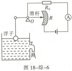 8. (多选)如图18-综-6所示是一种测定油箱内油量的装置。其中$R$是滑动变阻器的电阻片,滑动变阻器的滑片跟滑杆连接,滑杆可以绕固定轴$O$转动,另一端固定着一个浮子。当容器中的液面下降时,下列有关说法中正确的是(