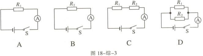 4. 下列电路中,已知$R_1$、$R_2$为加热电阻,电源电压相等,且$R_1<R_2$,则在相同的时间内,整个电路消耗电能最少的是(