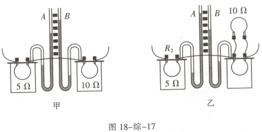 1. (多选)在“探究电流通过导体产生的热量与哪些因素有关”的实验中,某同学采用了如图18-综-17甲、乙所示的实验装置(两个透明容器中封闭着等量的空气)。下列说法正确的是(