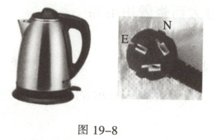3. 如图 19-8,电热水壶应使用三脚插头,插头上标有 E 的导线应该与电水壶的