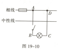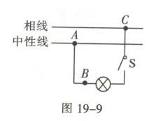 工作的。如图 19-9 所示的 B 点是灯头接导线的螺丝,当电路中的开关闭合时,灯不亮,经检查发现 AB 之间出现了断路,则站在地面上的人用手接触电路中的 B 点会