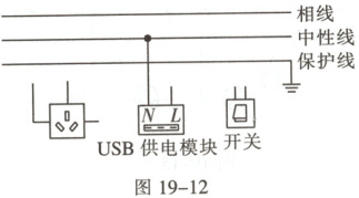 2. 随着家庭的各种电子设备的增加,很多插排增加了为电子设备充电的 USB 接口,减少了日常给电子设备找“充电器”的现象。通过拆解发现,插排内部除了提供普通三孔插座外,还内置了一个 USB 供电模块,通过两根线和家庭电路相连,三孔插座和供电模块由总开关控制,并且可以独立工作,请在图 19-12 中用笔画线代替导线将图补充完整。