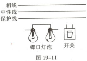 1. 小明想在卧室用一个开关同时控制两盏额定电压为 220 V 的壁灯,请在图 19-11 中帮他把灯和开关接入家庭电路中,让两盏灯正常工作。