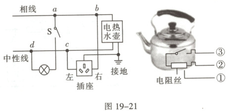 4. 生活应用 如图 19-21 是小聪家的部分电路和电热水壶的内部原理图,若小聪将电热水壶的插头插入插座,然后闭合开关时,空气开关跳闸,则原因可能是