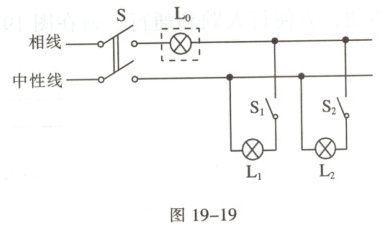 2. 如图 19-19 的家庭照明电路,已知其中一只灯泡的灯头接线处存在故障,电工师傅为查明故障,将保险丝处换接成一只“220 V 40 W”的灯泡 $L_0$,当只闭合开关 S、$S_1$ 时,灯泡 $L_0$ 和 $L_1$ 都呈暗红色(比正常发光状态暗得多),则说明 $L_1$ 所在支路