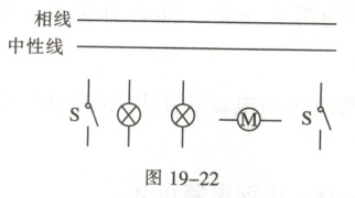1. 教室要安装两盏“220 V 40 W”的电灯和一台风扇。请完成图 19-22 中的电路连线。要求:一个开关控制两盏灯,且每盏灯都能正常发光;另一个开关控制风扇。