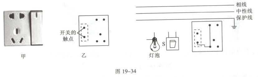 2. 如图 19-34 甲是一种“一开五孔”插座(面板上有开关、两孔插座和三孔插座各一个)的正面图,开关控制这个插座,它的优点是可以消除因插头频繁插拔而产生的安全隐患,如图乙是这种插座的背面示意图。请用笔画线代替导线,完成图中的电路连接(插座已完成部分电路的连接),要求开关 S 控制灯泡。