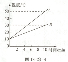 6. 为了比较$A$、$B$两种液体的吸热能力,小林用完全相同的加热装置对质量相等的$A$、$B$两液体进行加热,根据实验数据绘制的温度随时间变化的图像如图13-综-4所示。下列说法中正确的是(