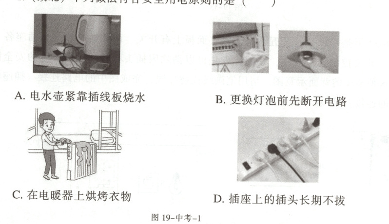 1.B[解析]电水壶紧靠插线板烧水,容易使水溅到插线板上,生活用水是导体,造成电路短路等情况,故A错误;更换灯泡前要先断开电路,故B正确;在电暖器上烘烤衣物,存在触电危险,故C错误;插座上的插头长期不拔,会引起发热等情况,甚至导致失火,故D错误。