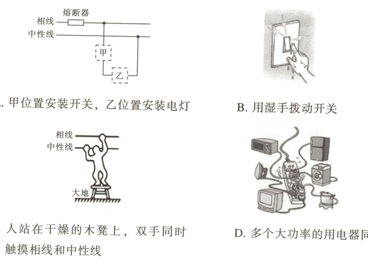2.A[解析]家庭电路中安装灯泡时,开关要接到相线上,然后接灯泡,故A正确;用湿手去拨动开关,易造成触电事故。故B错误;人站在干燥的木凳上,双手同时接触相线和中性线,电流流过心脏,造成触电事故。故C错误;多个大功率的用电器,同时使用,会使电路中的电流过大,产生大量的热量,温度升高,导线易燃烧引发火灾,故D错误。