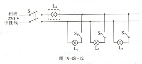 4. 如图 19-综-12 所示,使用检验灯泡 L₀(额定电压 220 V) 检查新安装的照明电路中每个支路的情况。当 S 闭合后,再分别闭合 S₁、S₂、S₃(每次只闭合其中之一) 时,可能出现 “短路” “断路” 或 “正常” 三种情况,试判断:只闭合 S₁ 时,L₀ 不亮,说明该支路