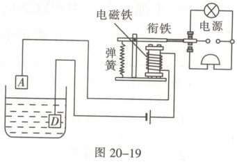 1. 如图20-19所示是一个水位自动报警器,当水位没有到达$A$时电磁铁中无电流,磁铁无磁性;当水位到达$A$时电磁铁中有电流,电磁铁有磁性吸引衔铁。下列有关说法中正确的是(