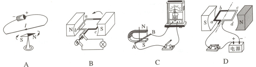 6. (多选)如图20-24是一种手腕上佩戴的“计步器”,其构造是在一段塑料管中密封一小块磁铁,管外缠绕着线圈。运动时,磁铁在管中反复运动,线圈的输出电流随之不停地变化,显示出运动的步数。“计步器”的基本原理与下列哪幅图不相同(