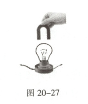 3. 小刚将“$220 V 100 W$”的灯泡接在家庭电路上,闭合开关,用一蹄形磁铁去靠近灯泡的玻璃泡,如图20-27,他发现发光的灯丝晃动了,这是因为
