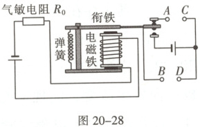 4. 如图20-28是山山设计的汽车尾气中$CO$排放量的检测电路,当$CO$浓度高于某一设定值时,电铃发声报警,图中气敏电阻$R_0$的阻值随$CO$浓度的增大而减小,电铃应接在