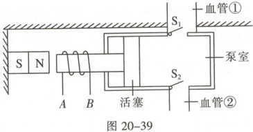 6. (多选)人工心脏泵可短时间代替心脏工作,其结构如图20-39,线圈$AB$固定在活