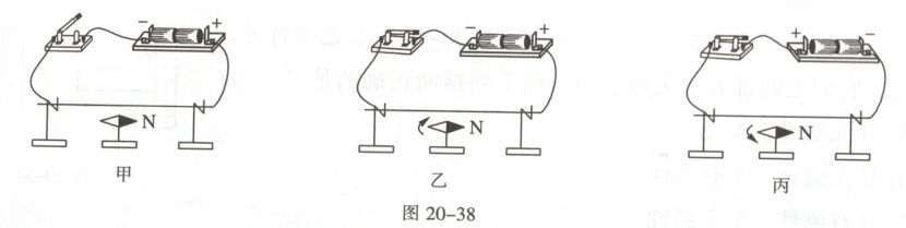 5. (多选)某同学研究电流产生的磁场,闭合开关前,小磁针的指向如图20-38甲;闭合开关,小磁针的偏转情况如图20-38乙中箭头;只改变电流方向,再次进行实验,小磁针的偏转情况如图20-38丙中箭头所示。下列结论中合理的是(
