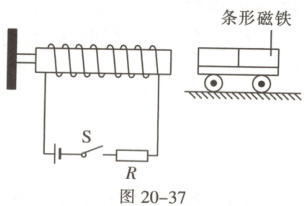 4. 如图20-37,电磁铁的左端固定,条形磁铁固定于条形磁铁小车上,闭合开关,小车向右运动,下列分析正确的是(