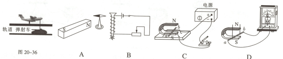 3. 科技发展 我国的新型航母将采用自行研制的电磁弹射器,小明猜想它的工作原理如图20-36,电磁弹射器的弹射车与飞机前轮连接,并处于强磁场中,当弹射车内的导体通过强电流时,即可受到强大的推力,小明的猜想与下列实验原理相同的是(
