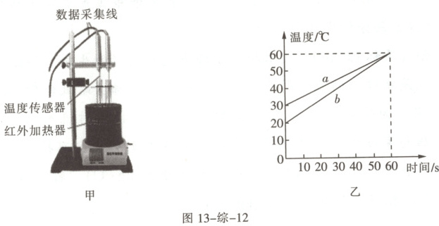 1. 科学探究为了“比较不同物质吸收热量的情况”,实验小组同学将两个试管分别放置在温度传感器中,并将其固定在铁架台上(图13-综-12甲),往试管中加入不同的液体,温度传感器的探头部分与试管内的液体接触良好,加热液体,传感器通过数据采集线与计算机相连接并生成实验图像(图13-综-12乙)。