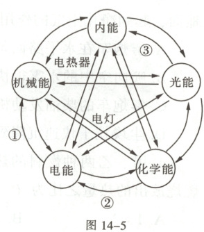 2. 各种形式的能在一定条件下可以相互转化,请你依照图 14-5 中给出的两个示例,依次写出电能转化为机械能、化学能转化为电能、光能转化为内能的实例。