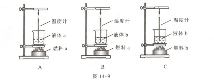 科学探究 如图 14-9 所示,A、B、C 三个实验装置完全相同,燃料的质量都为 10 g,烧杯内液体的质量都相同。