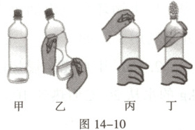 1. 跨学科实践 小明用塑料矿泉水瓶进行了如下探究:瓶中留有少量水,盖上瓶盖(如图14-10 甲);扭转瓶身(如图14-10 乙);拧松瓶盖(如图14-10 丙),瓶盖被瓶内的气体冲出,同时瓶口出现白雾(如图14-10 丁)。图乙和图丁所示的过程,分别与四冲程内燃机两个冲程类似,下列说法正确的是(