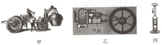 材料一:1769年,法国人居纽制造出蒸汽机推动的三轮汽车(图甲),传统蒸汽机的燃料在汽缸外部燃烧(图乙),热效率为5%~8%之间。