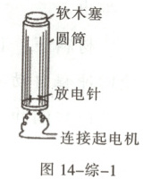 1. 跨学科实践 某小组同学制作了一个“汽油机模型”。如图14-综-1所示,将适量的汽油喷入圆筒内,用软木塞塞住筒口,当放电针释放电火花时,软木塞被冲出。下列说法正确的是(
