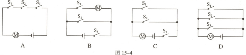 4. 如图 15-4 所示,某一型号的锁设置了三种打开方式:密码($S_1$),特定指纹($S_2$)或应急钥匙($S_3$),三者都可以单独使电动机 M 工作而打开门锁,下列电路设计符合要求的是