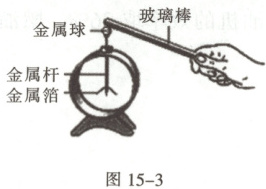 3. 如图 15-3 所示,将用丝绸摩擦过的玻璃棒接触验电器的金属球后,发现验电器的金属箔片张开了一定的角度,下列说法正确的是(