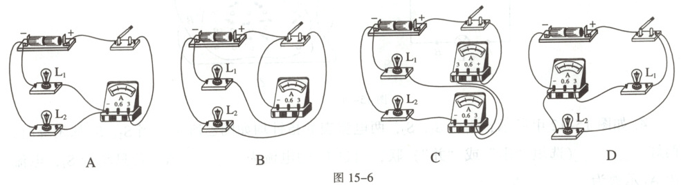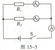 5. 如图 15-5 所示,在探究“并联电路的电流规律”时,闭合开关 S 后,电流表$A_1$的示数是$0.1 A$,电流表$A_2$的示数是$0.3 A$,则电流表 A 的示数是(