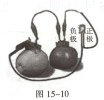 2. 如图 15-10 所示,两只水果点亮了一只发光二极管,此时水果是这个电路里的 (选填“电源”或“用电器”);两水果之间是