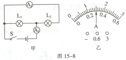 8.(多选)如图 15-8 甲电路,闭合开关 S 后,两个灯泡都能发光,乙图为电流表$A_1$指针的位置,如果电流表$A_2$的读数是$0.5 A$,则下列说法正确的是(