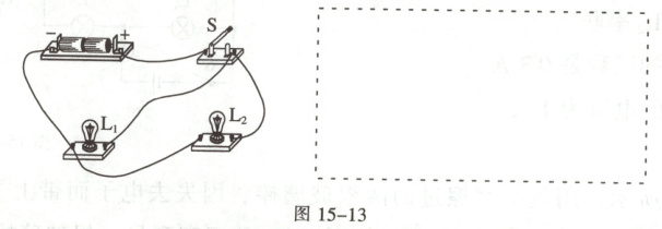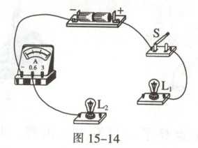 2. 如图 15-14 所示是未完成连接的实物电路,请用笔画线代替导线完成该电路连接。要求:两灯并联,开关 S 同时控制两灯,电流表测量干路电流,导线不能交叉。
