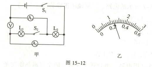 4. 如图 15-12 甲所示,闭合$S_1$、$S_2$,两电流表的指针均如图乙所示。当$S_1$、$S_2$都闭合时,两灯