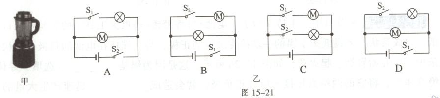 3. 生活应用 破壁机可以瞬间击破食物细胞壁,让食材营养释放更充分。某品牌破壁机(如图15-21甲)设置了安全开关$S_1$和工作开关$S_2$,当杯体放在主机上时$S_1$自动闭合,安全指示灯亮起;再闭合$S_2$,电动机启动破壁,下列电路图符合上述要求的是(